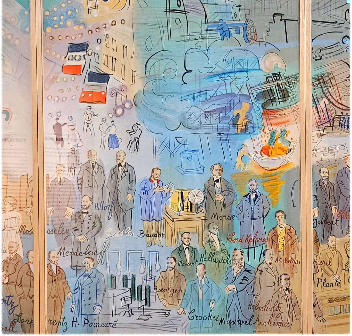 그의 대표작 중 하나는 〈전기 요정(La Fée Électricité, 1937)〉입니다. 이 작품은 1937년 파리 만국 박람회를 위해 제작된 대형 벽화로, 프랑스 전기회사의 의뢰를 받아 완성되었습니다. 길이 60미터가 넘는 이 작품은 전기의 발달과 그에 따른 인류 문명의 진보를 주제로 삼고 있으며 이 작품에서 뒤피는 인물과 기계, 자연, 도시 등을 밝은 색조와 리드미컬한 선으로 묘사하며, 마치 교향곡처럼 시각적 리듬을 구성하였습니다.